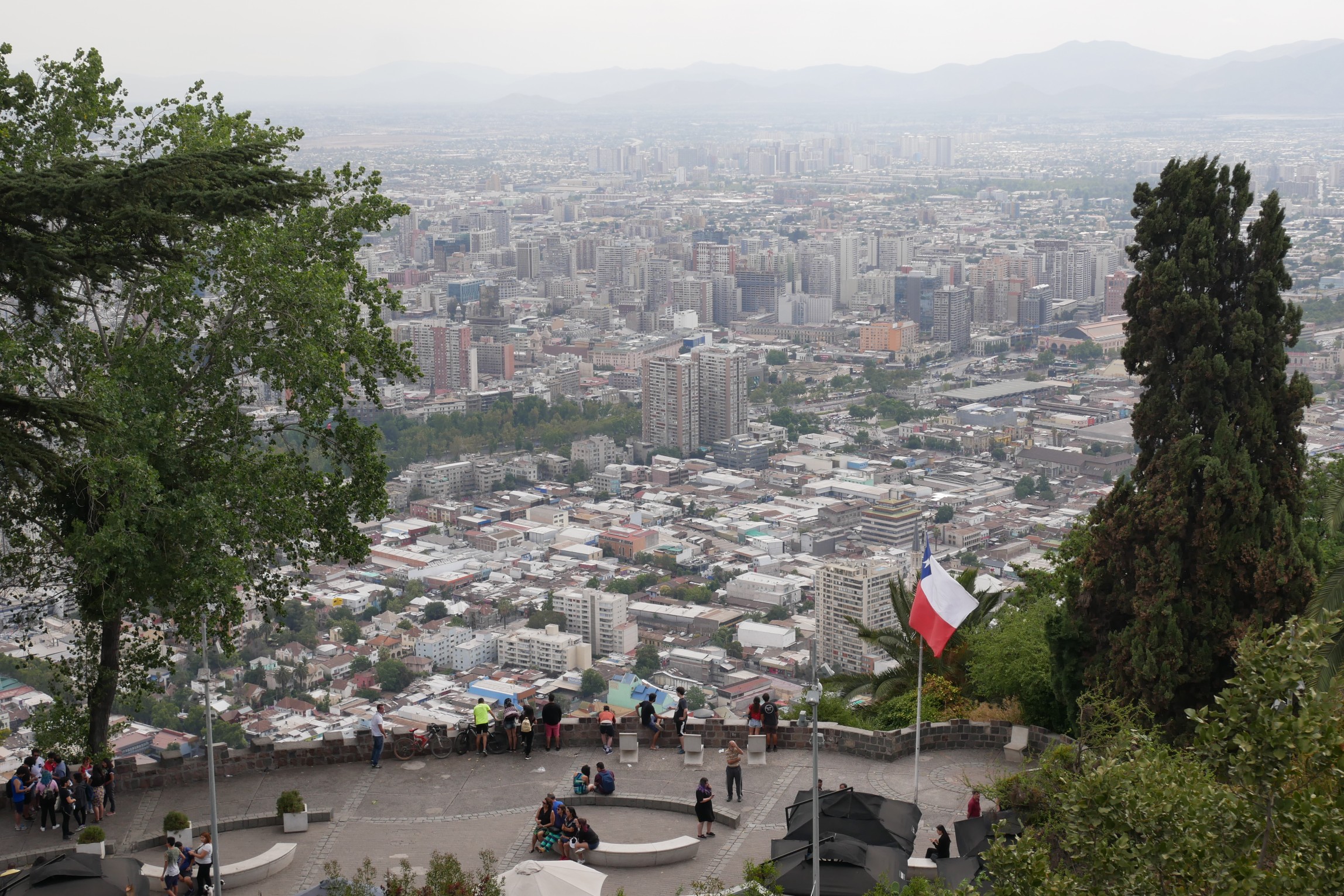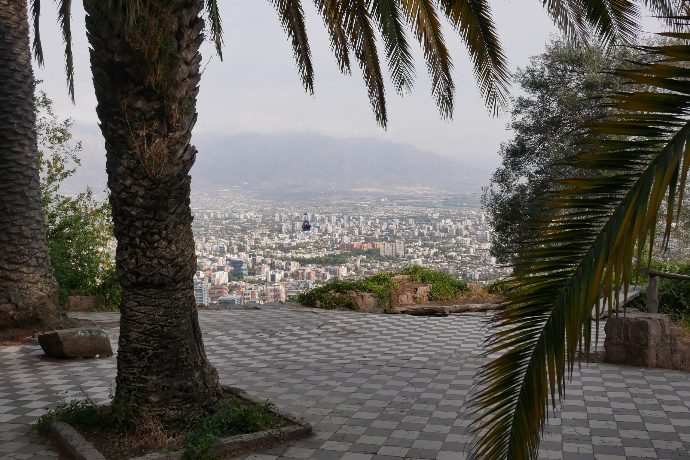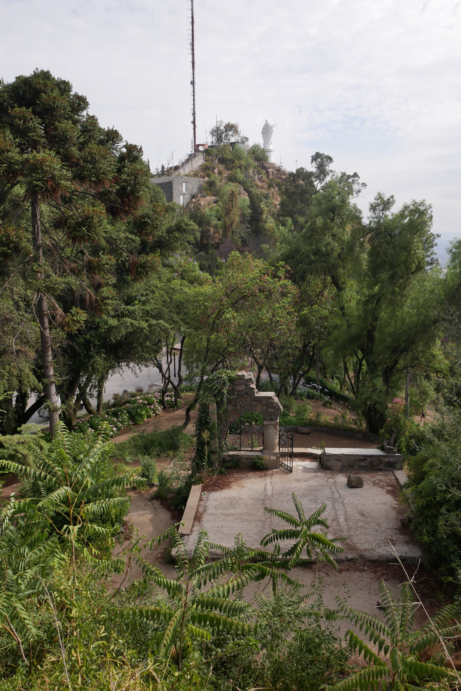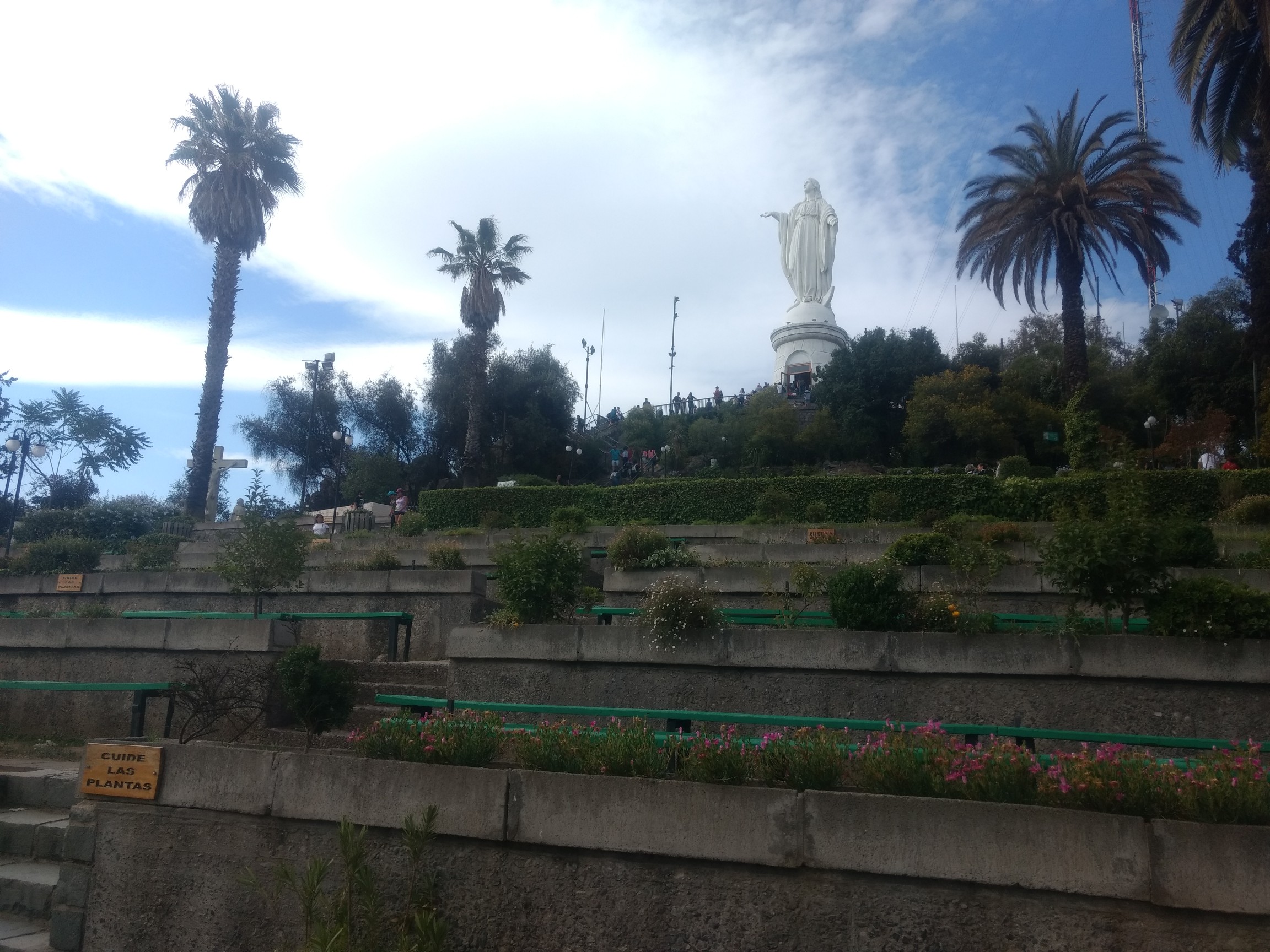 Am Nachmittag ging es dann weiter auf den Cerro San Cristobal. Mit ungefähr 300 Höhenmetern oberhalb der Innenstadt bietet er eine wunderbare Aussicht über die chilenische Hauptstadt. Theoretisch gibt es eine Seilbahn, aber trotz ungefähr 30 Grad war mir der Aufstieg zu Fuß lieber (da kommt bei mir weniger Panik auf :-D ). Am Gipfel befindet sich eine Heiligenstatue und rundherum eine Art Freiluftkirche.