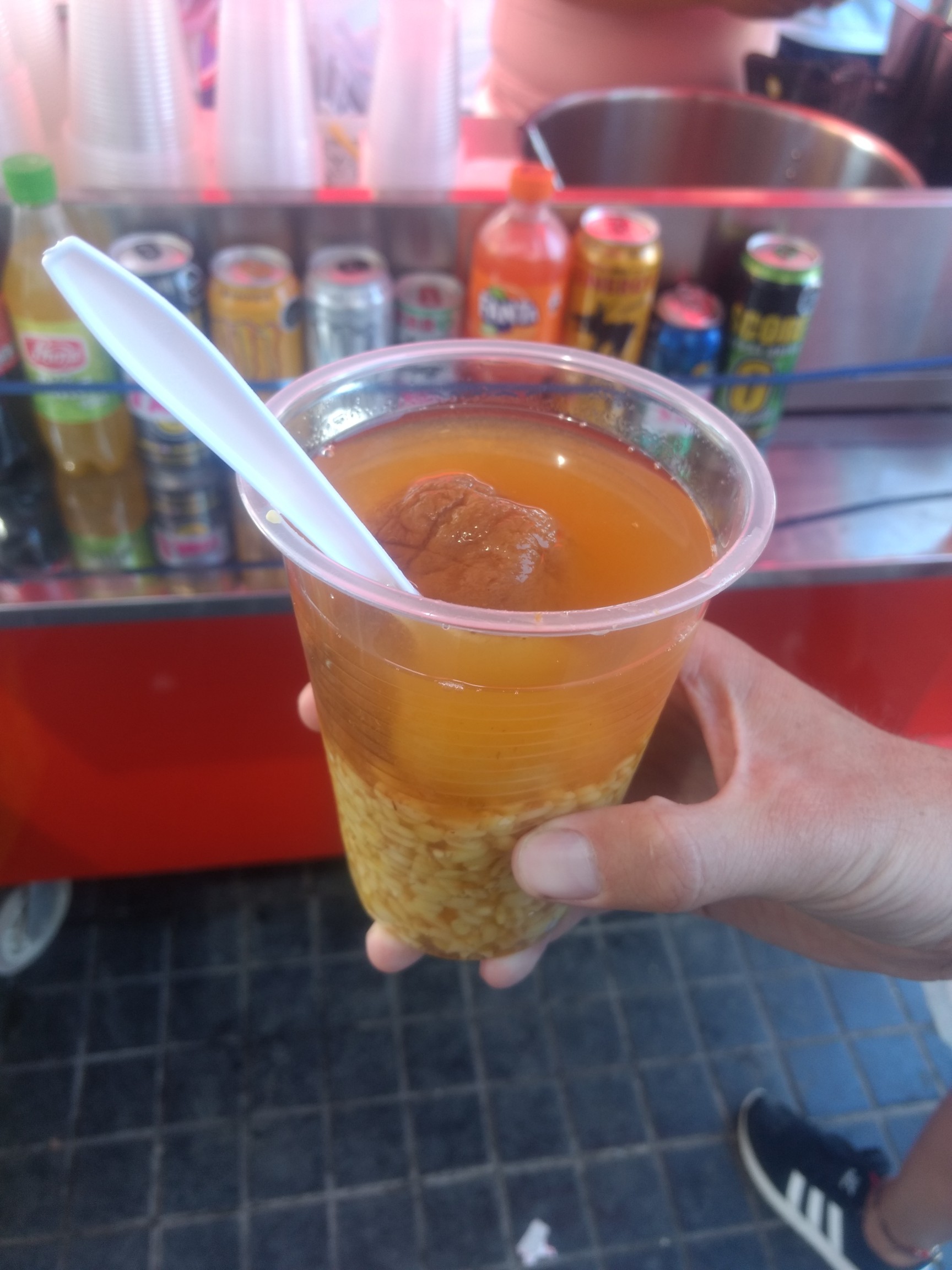 Da die Flüge in Südamerika doch so langsam ins Geld gehen, habe ich mich nach einer günstigen Möglichkeit umgeschaut und musste deshalb nochmal in Santiago vorbei. Den einen Tag habe ich für einen Ausflug ins Valle del Maipo genutzt. Auf dem Weg zum Bus habe ich mir Mote con Huesillo gegönnt, eine chilenische Spezialität aus Pfirsichnektar, gekochtem Weizen und einem getrockneten Pfirsich. Das Ganze ist dank des Weizens erstaunlich sättigend, allerdings wegen des kompletten Pfirsichs inklusive Kern.
