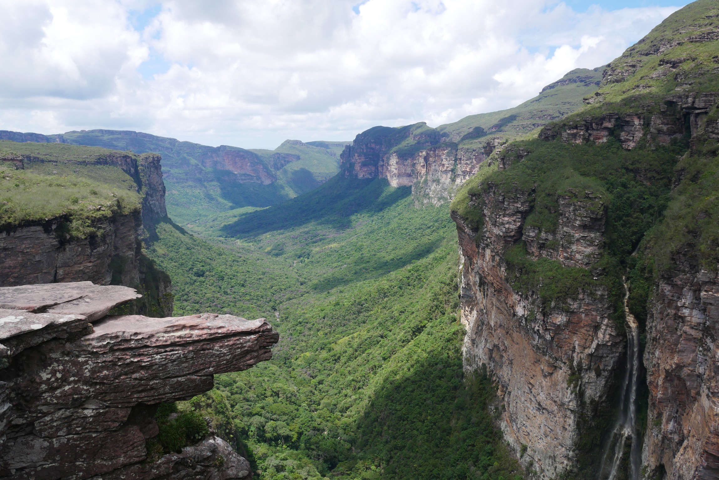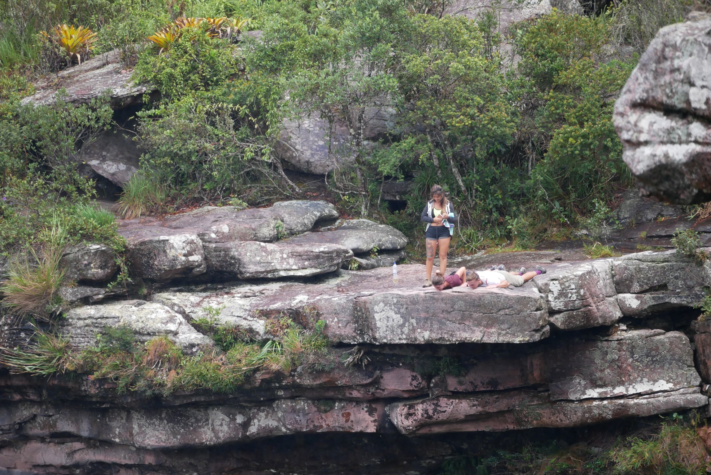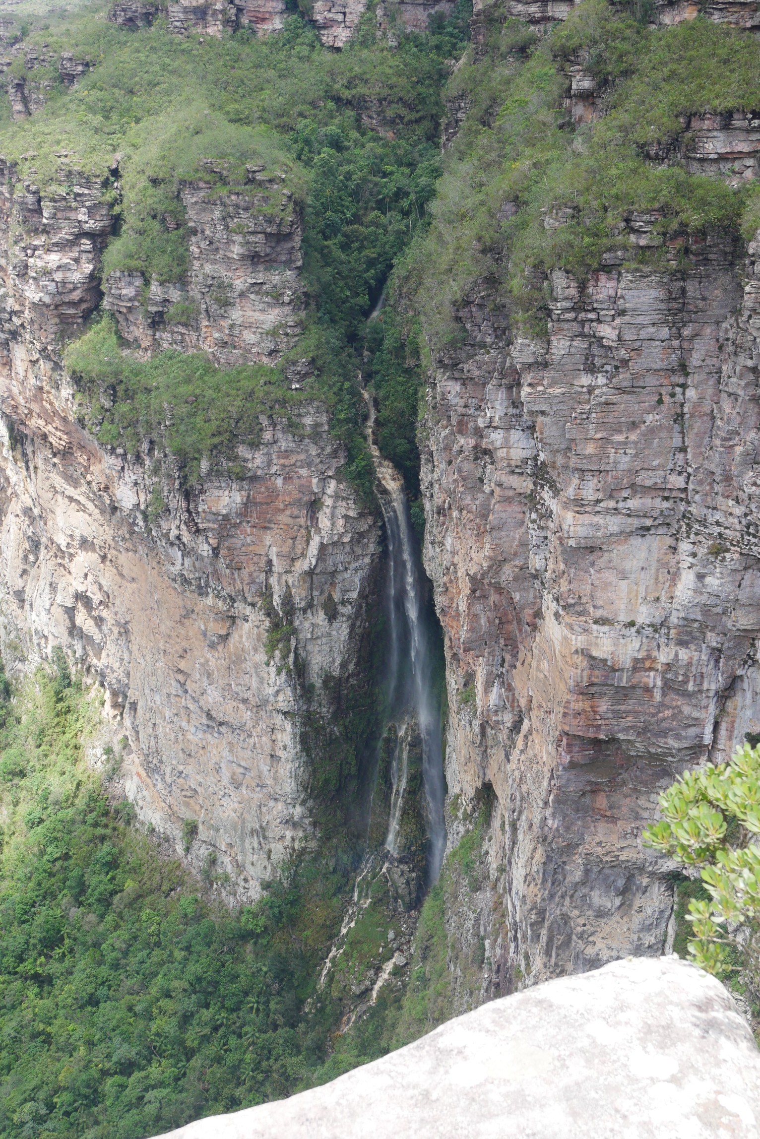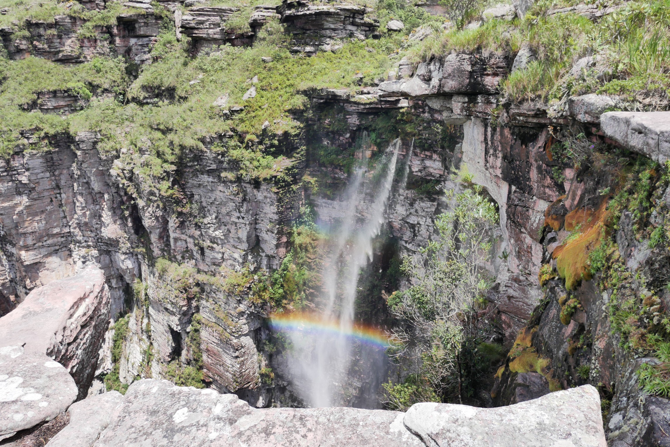 Am Weg selbst war nicht so viel zu sehen. Doch dann kam die Kante. Rechts dünne, aber hohe Wasserfälle und nach tiefem Durchatmen und einigen weiteren beherzten Schritten ein Regenbogen in der Tiefe. Und... der Sattel. Davon gab es am Tag davor Fotos. Theoretisch kann man wahnsinnig beeindruckende Fotos machen, wenn man auf den vorstehenden Felsen sitzt. Sofern man Leute dabei hat und sich traut. Beides war bei mir nicht der Fall :-D