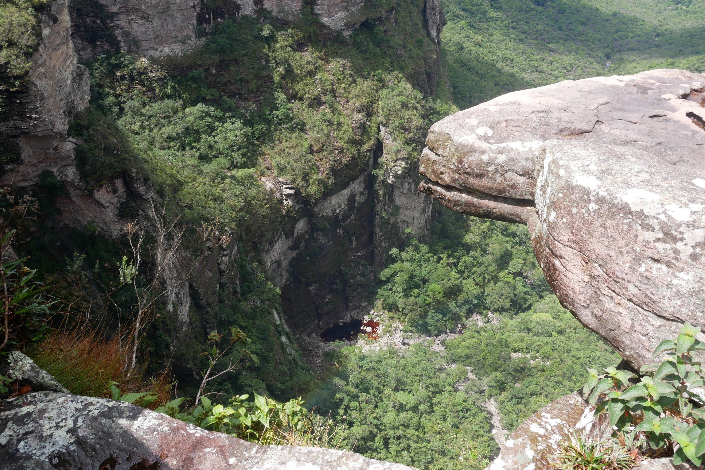 Vom überhängenden Felsen ca. 100 Meter weiter konnte man sich die Wasserfälle noch genauer anschauen, so wie hier von einer Reisegruppe mit Führer demonstriert. Ich selbst habe mir, als ich ein paar Minuten später dort war, eine Stelle ein wenig weiter rechts ausgesucht, statt über die gerade Kante habe ich an der Ecke nach unten gespäht. Ging doch ziemlich weit nach unten... Puls von 160 und leichtes Hyperventilieren hielt ich einige Sekunden aus, dann ging es wieder auf allen Vieren einen halben Meter und dann noch zwei, drei Schritte zurück.