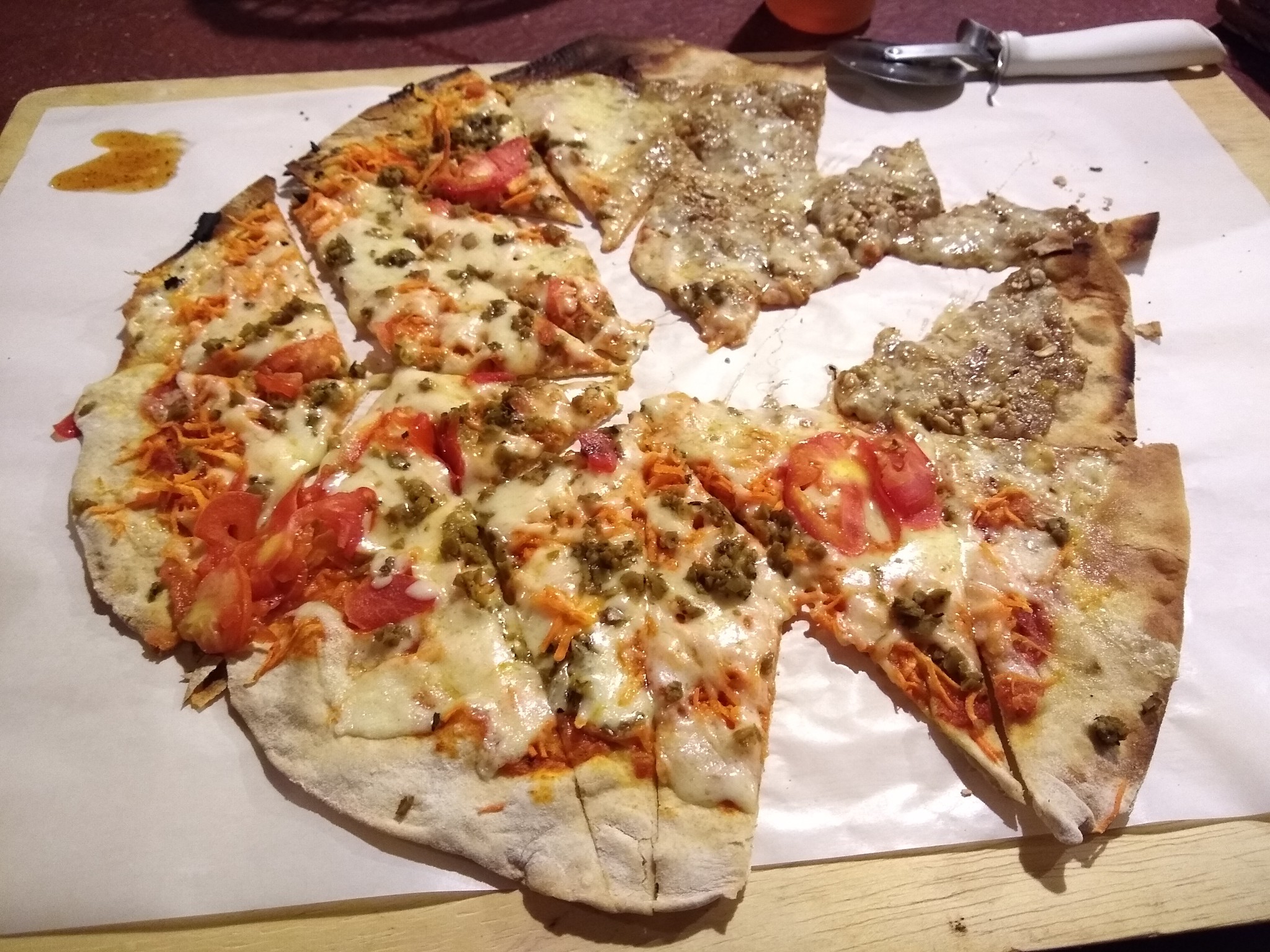 Zum Abendessen war die Auswahl wegen der späten Uhrzeit eher gering, ich habe es aber zum Glück sehr gut erwischt. Die Pizzeria hatte nur die Auswahl zwischen "salzig" und "süß". Süße Pizza? Interessant... Ich habe mir dann ein Viertel süß belegen lassen. Banane, Käse und zwei Sorten Nüsse. Hat besser zusammen gepasst, als ich erwartet hätte. Zum Dippen gab es entweder Honig für den süßen oder Honig mit Chili für den salzigen Teil, auf dem verschiedene Gemüsesorten und Käse auf Tomatensoße lagen. Auch das hat erstaunlich gut funktioniert. Vielleicht backe ich mir das zu Hause mal nach :-)